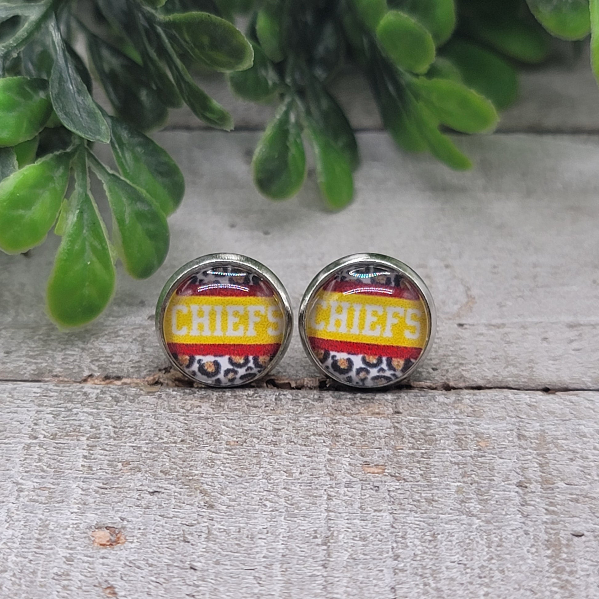 CHIEFS on Leopard | 12mm Glass Stud Earrings | Hypoallergenic