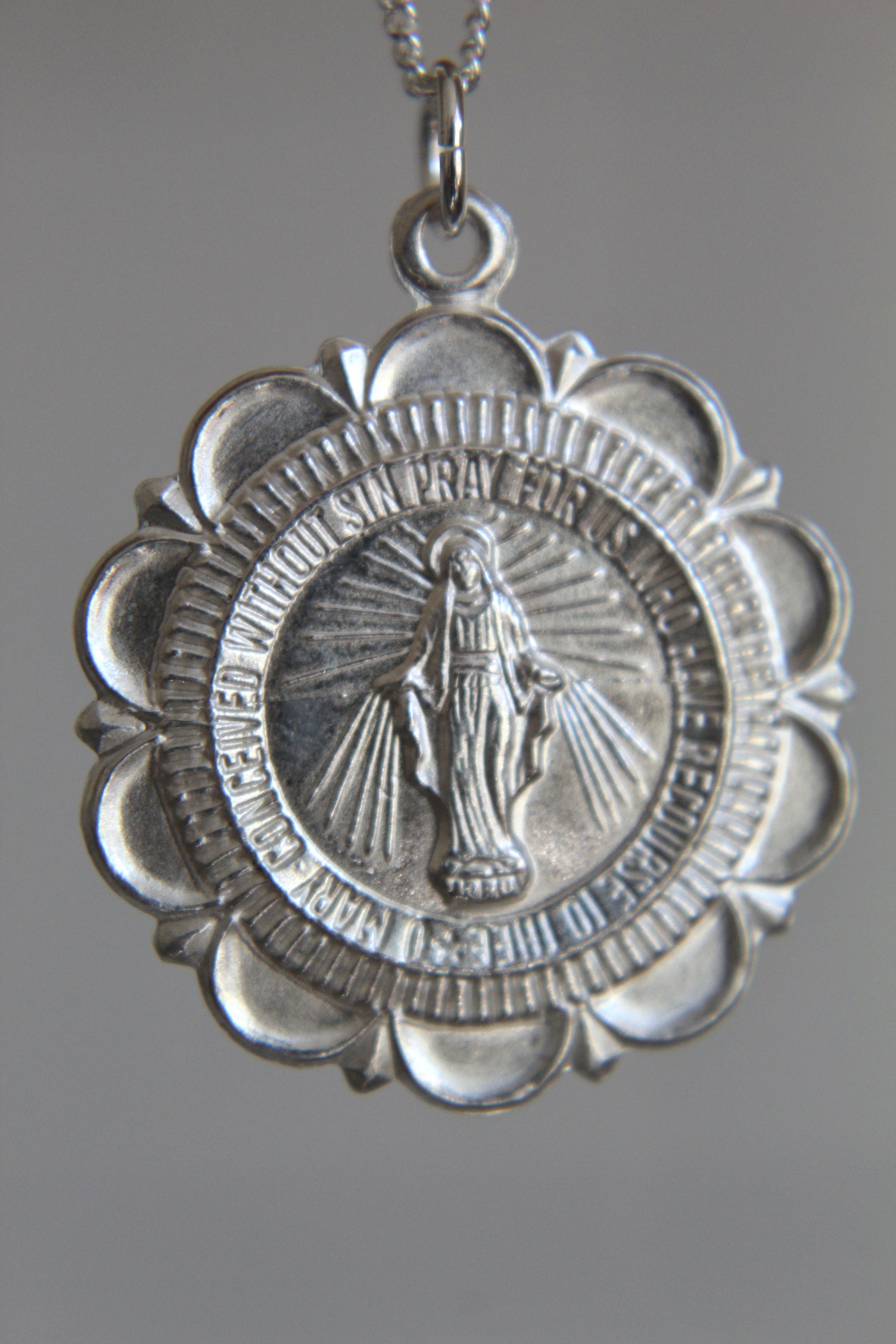 The Miraculous Medal given to St Catherine Laboure from Our Lady who promised all who wear this image will receive great graces. The front of the medal stands on a globe crushing the head of the serpent symbolizing her role as the new Eve. The back of the medal with an "M" below a cross where Mary stands firm at the foot with all of us who worship her Son, Our Lord. The Cross on the Back of This Miraculous Medal necklace is Called a Marian Cross. Shop the Rest of the Miraculous Medal Collection, Click Here.